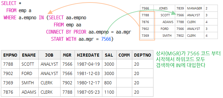 mgr = 7839로 시작위치를 지정하면 JONES(7566)부터 계층이 만들어진다.
