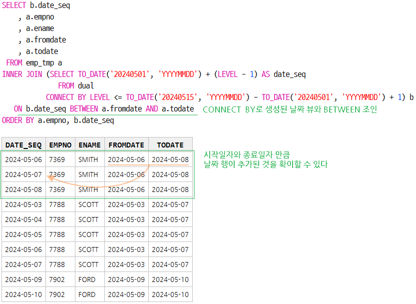 바로 위의 예제를 응용하여 시작일자와 종료일자가 있는 데이터와 조인하면, 해당 기간의 구만만큼 날짜를 채워서 행을 증가시킬 수 있다.