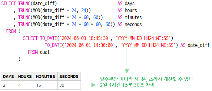 TRUNC(MOD( date_diff * 24 * 60 * 60, 60)) AS seconds는 날짜 차이를 초 단위로 변환한 후, 60으로 나눈 나머지를 추출하여 초를 계산한다.