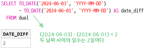 오라클에서는 날짜에서 날짜를 빼면 차이가 일수로 반환된다. 날짜에 시간까지 포함되어 있다면, 시간까지 계산되어 반환되므로 원하는 일수가 반환되지 않을 수 있으니 주의해야 한다.