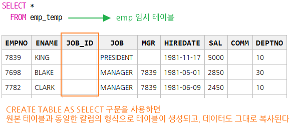 CREATE TABLE AS SELECT 구문을 사용하면 SELECT 절의 칼럼 형식을 그대로 복사해서 테이블을 생성하고, 데이터도 그대로 복사하기 때문에 쉽게 테이블을 생성할 수 있다.