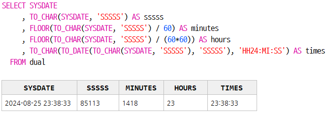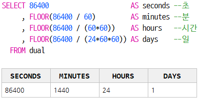 초를 시간으로 변환 ( FLOOR(86400 / (60*60)) ) :
