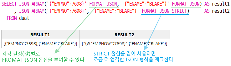 JSON 형식이 아닌 값에 FORMAT JSON 옵션을 부여하면 오류가 발행하니 주의해야 한다.