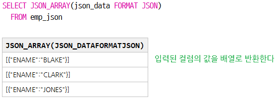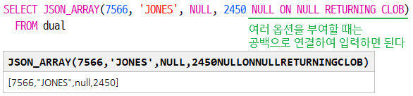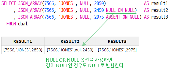 | NULL ON NULL | NULL 값을 JSON 배열에 포함 |