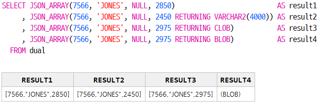, JSON_ARRAY(7566, 'JONES', NULL, 2975 RETURNING CLOB) AS result3