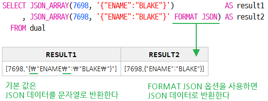 , JSON_ARRAY(7698, '{"ENAME":"BLAKE"}' FORMAT JSON) AS result2