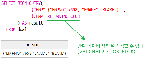 | RETURNING | 반환되는 데이터 유형을 지정한다. 기본값은 VARCHAR2(4000) 이며, CLOB, BLOB를 지정할 수 있다. |