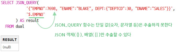 JSON_QUERY 함수는 단일 값(숫자, 문자열 등)은 추출하지 못한다.