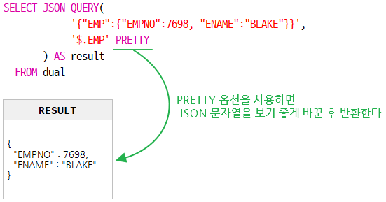 | PRETTY | 반환되는 JSON 문자열을 보기 좋게 들여쓰기와 줄 바꿈을 적용한다. |