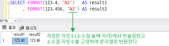 SELECT FORMAT(123.4, 'N2') AS result1