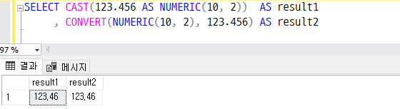 , CONVERT(NUMERIC(10, 2), 123.456) AS result2