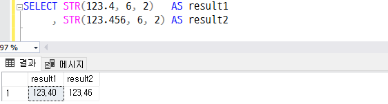 , STR(123.456, 6, 2) AS result2