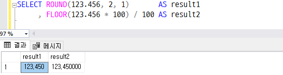 FLOOR(123.456 * 100) / 100은 숫자를 100배 해서 정수로 만든 뒤 내림(FLOOR) 처리한 후 다시 100으로 나누며 123.45 반환한다.