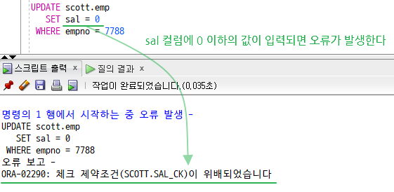 위의 CHECK 제약조건( sal > 0 )을 설정하면 sal 칼럼에 0 이하의 값이 입력되면 오류가 발생한다.
