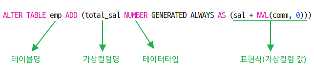 total_sal NUMBER GENERATED ALWAYS AS (sal + nvl(comm, 0)) --가상컬럼