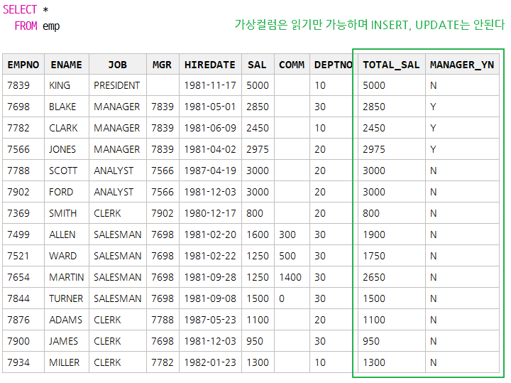 위의 예제에서 추가한 가상 컬럼 TOTAL_SAL, MANAGER_YN 컬럼의 값이 조회되는 것을 확인할 수 있다.