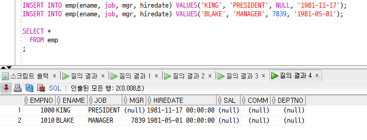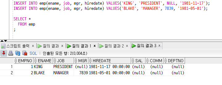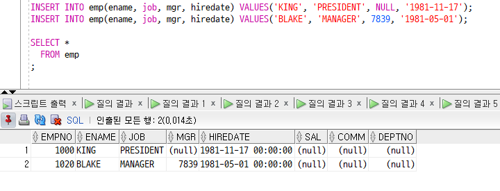 위의 CREATE TABLE 구문에서 직원번호(empno) 컬럼 뒤에 NUMBER GENERATED ALWAYS AS IDENTITY 속성을 지정하여 직원 테이블에 데이터가 입력되면 empno 컬럼이 순차적으로 증가하는 것을 확인할 수 있다.