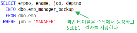 SELECT INTO는 SELECT 결과를 바탕으로 테이블을 즉석에서 생성하고, 동시에 데이터를 저장한다.