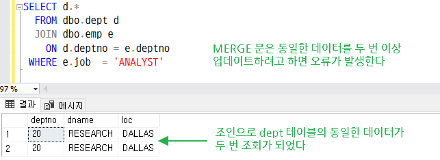 MERGE 문은 업데이트할 데이터가 중복으로 조회되는 경우 오류가 발생할 수 있다.