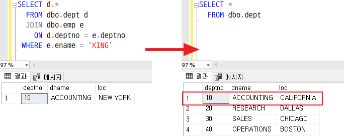 JOIN UPDATE 쿼리문을 실행하고 부서(dept) 테이블의 값이 "NEW YORK"에서 "CALIFORNIA"로 변경된 것을 확인할 수 있다.