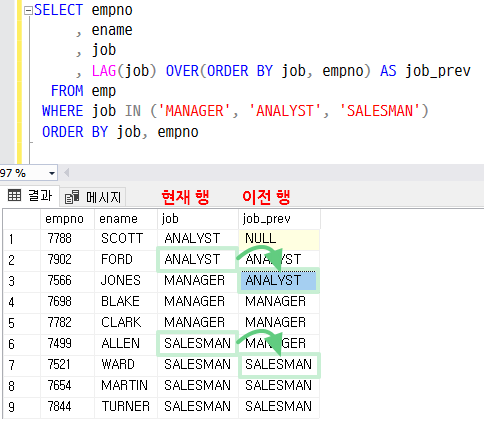 , LAG(job) OVER(ORDER BY job, empno) AS job_prev