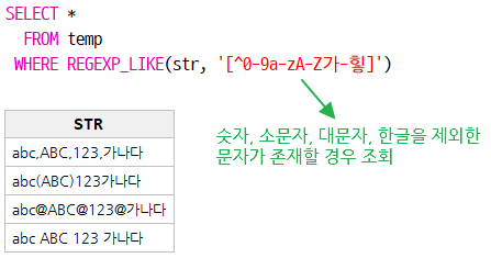 WHERE REGEXP_LIKE(str, '[^0-9a-zA-Z가-힣]')